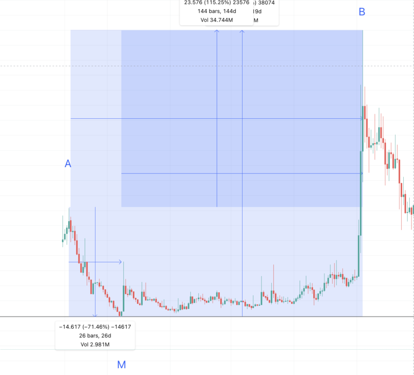 A a M = 26 dias e variação de preço de -71,46%; M para B = 119 dias e variação de preço de 645,60; A a B = 145 dias e 115,25% de variação de preço.