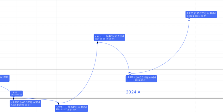 Isso surge em 130 dias (máximo de 189 dias) e com uma porcentagem de crescimento de 30,70% (máximo de 115,25%). Portanto, a alta de 2025 chega a US$ 8,82 em 2025. Podemos marcar isso como 2025 B. De acordo com o modelo de previsão de preço da UMA para 2025, a mínima pode chegar a US$ 5,876, o que coincide com um forte nível de suporte.