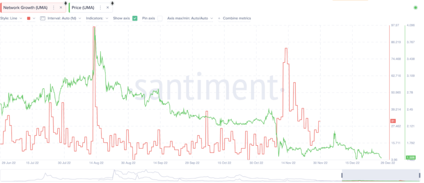 O crescimento da rede tem sido constante, com o pico visível em meados de novembro. Olhando de perto o gráfico de crescimento da rede, fica claro que os preços caíram após os picos (mesmo o de agosto). O crescimento sustentado na atividade de rede pode ser necessário para aumentar o preço da UMA.
