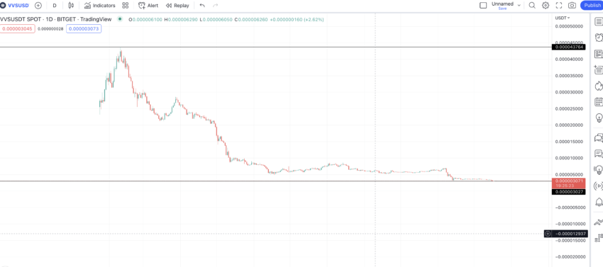 Antes de iniciarmos a análise técnica, podemos observar o gráfico diário do par de negociação VVS-USDT. Observe que extraímos o gráfico Bitget, pois o par Bitget VVS-USDT é o maior mercado em termos de volume. Aqui estão os principais insights que podemos inferir do gráfico:
