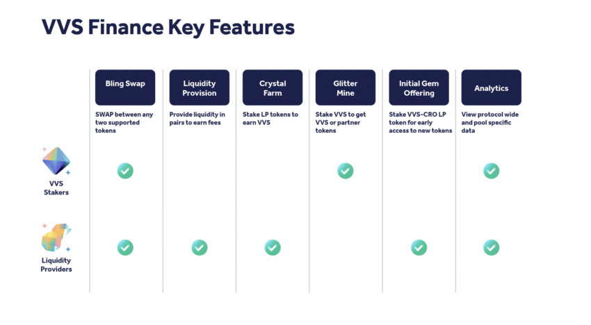 Para começar, a VVS Finance conta com um AMM (criador de mercado automatizado) para o fornecimento inicial de liquidez necessária para operações DeFi. Quanto aos recursos, ele atualmente oferece suporte à troca e aposta de tokens.