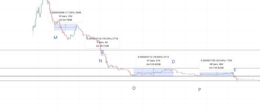 Portanto, se traçarmos o caminho de Q, a próxima alta poderá ser de US$ 0,000004106 no início de janeiro. Vamos marcá-lo F. Tendo em mente o movimento médio e o mercado criptográfico atual, a baixa de F pode ocorrer em no máximo 44 dias. Essa queda média é de 50,69%.