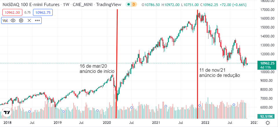 A inflação e o QE não são as duas únicas coisas intimamente ligadas. Vamos usar como exemplo o desempenho da Nasdaq e o momento do QE. O BCE anunciou seu primeiro pacote QE de 750 bilhões de euros no dia 18 de março. Já o Federal Reserve anunciou o seu primeiro “pacote abrangente e em larga escala de 700 bilhões de dólares em QE” no dia 15 daquele mês. Os bancos centrais salvaram o mercado de ações.