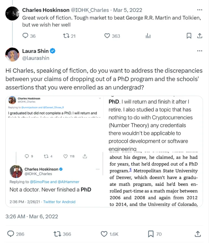 Em fevereiro de 2022, Laura Shin, uma jornalista de criptomoedas, apresentadora do podcast Unchained e autora de The Cryptopians, sugeriu em seu livro que Charles Hoskinson nunca concluiu sua graduação ou se matriculou em um programa de doutorado.