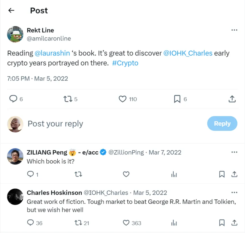 A controvérsia começou no X, quando um usuário tuitou que estava lendo o livro de Shin e ficou fascinado pelos primeiros anos de Hoskinson em criptomoedas. Hoskinson respondeu ao tuíte, chamando o livro de “grande obra de ficção”.