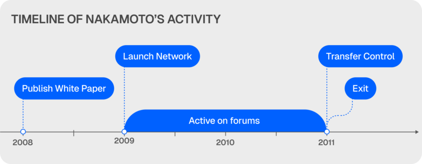 No final de 2010, Nakamoto entregou as rédeas do Bitcoin a outros desenvolvedores, principalmente Gavin Andresen, e desapareceu da cena.