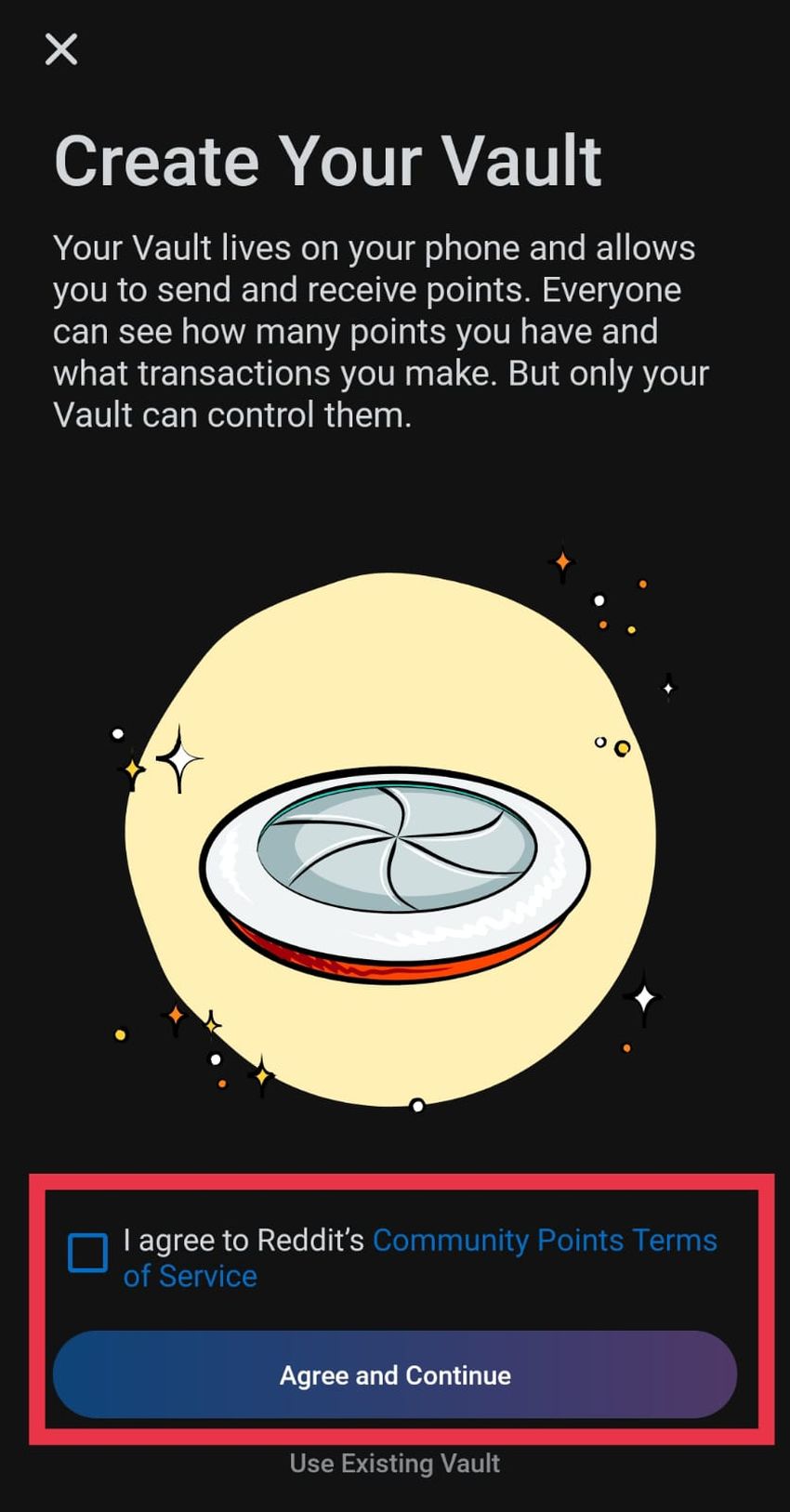 Passo 2: Você será solicitado a criar um novo cofre. Antes de prosseguir, você deve marcar a caixa “Concordo com os Termos de Serviço dos Pontos da Comunidade Reddit”.