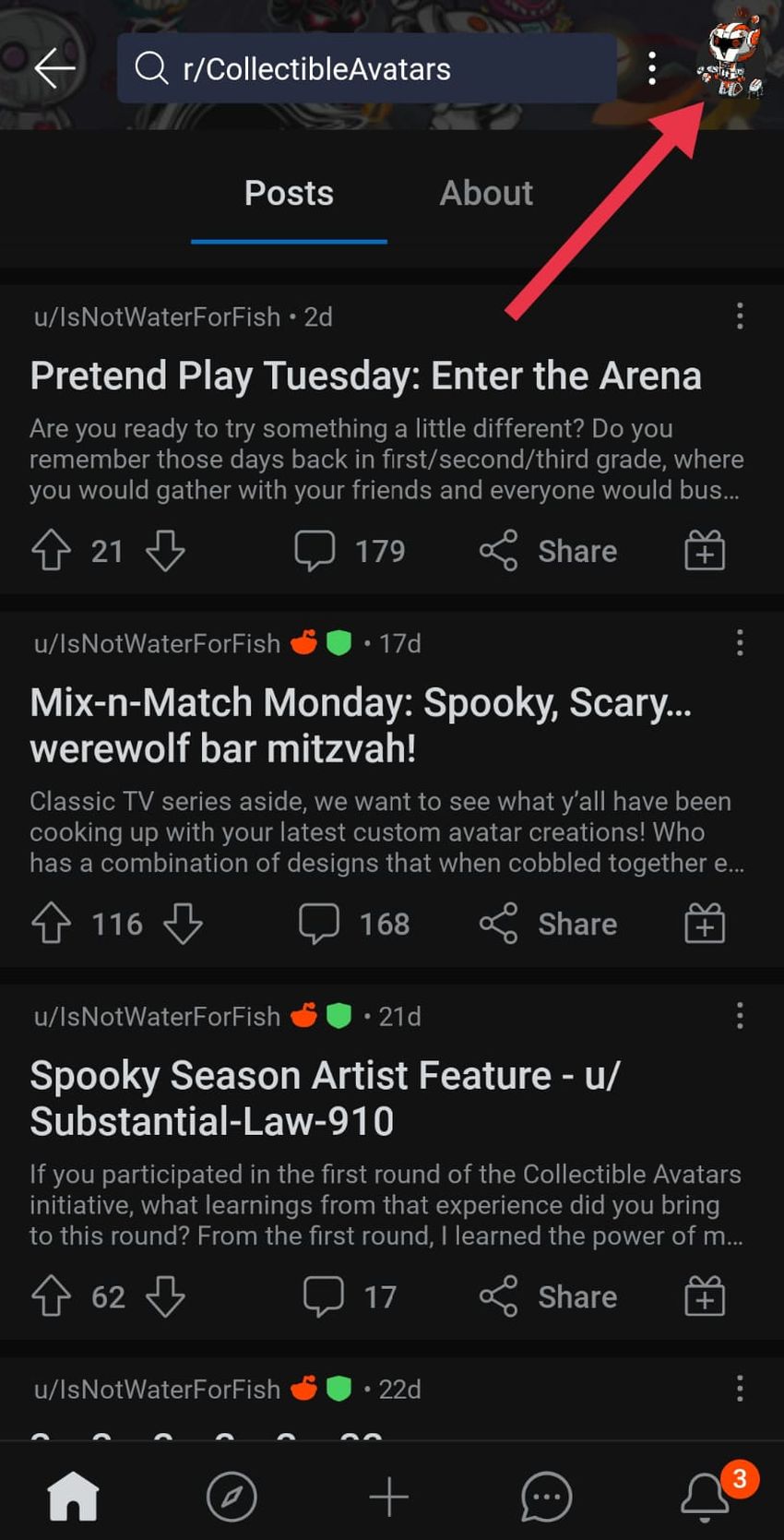 Depois de reivindicar seu Avatar Colecionável, ele pode ser encontrado em seu cofre do Reddit. Você pode visualizar e habilitar seu avatar colecionável em seu perfil clicando em “Estilizar meu avatar > Você > Suas coisas”.