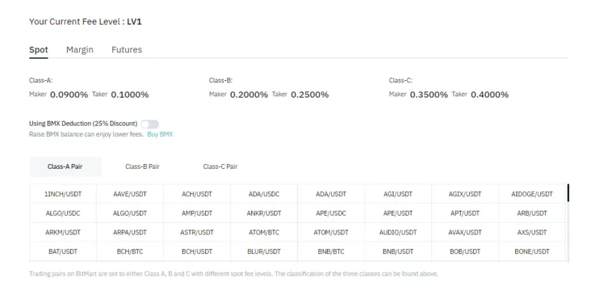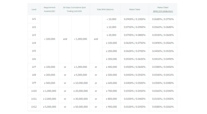 Existem três classes diferentes de taxas de negociação: à vista, margem e futuros. Esta classe usa uma tabela de taxas escalonadas e regressivas. Em outras palavras, suas taxas são calculadas pelo seu volume de negociação de 30 dias. Quanto mais você negocia, menores serão suas taxas. Além disso, ao possuir o token da plataforma, BMX, você receberá uma dedução de 25%.