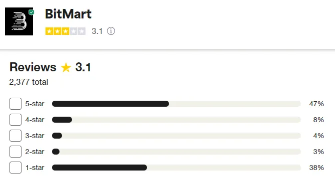 Em termos de avaliações de clientes, a BitMart tem uma pontuação Trustpilot de 3,1 em 5, com a maioria das avaliações divididas entre uma e cinco estrelas. Com base em mais de 2.000 avaliações, muitos usuários odeiam ou adoram (como costuma ser a natureza paradoxal das avaliações online). As críticas positivas tendem a destacar a interface e o design fáceis de usar. Por outro lado, as análises negativas tendem a destacar momentos em que os fundos foram retidos.