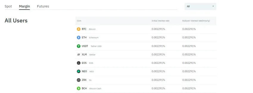 As taxas de margem são bastante simples. Você incorrerá em uma taxa de juros inicial e em uma taxa de juros de prorrogação por hora. As taxas variam de acordo com a criptomoeda e variam de 0,001117% no mínimo a 0,3636% no máximo.