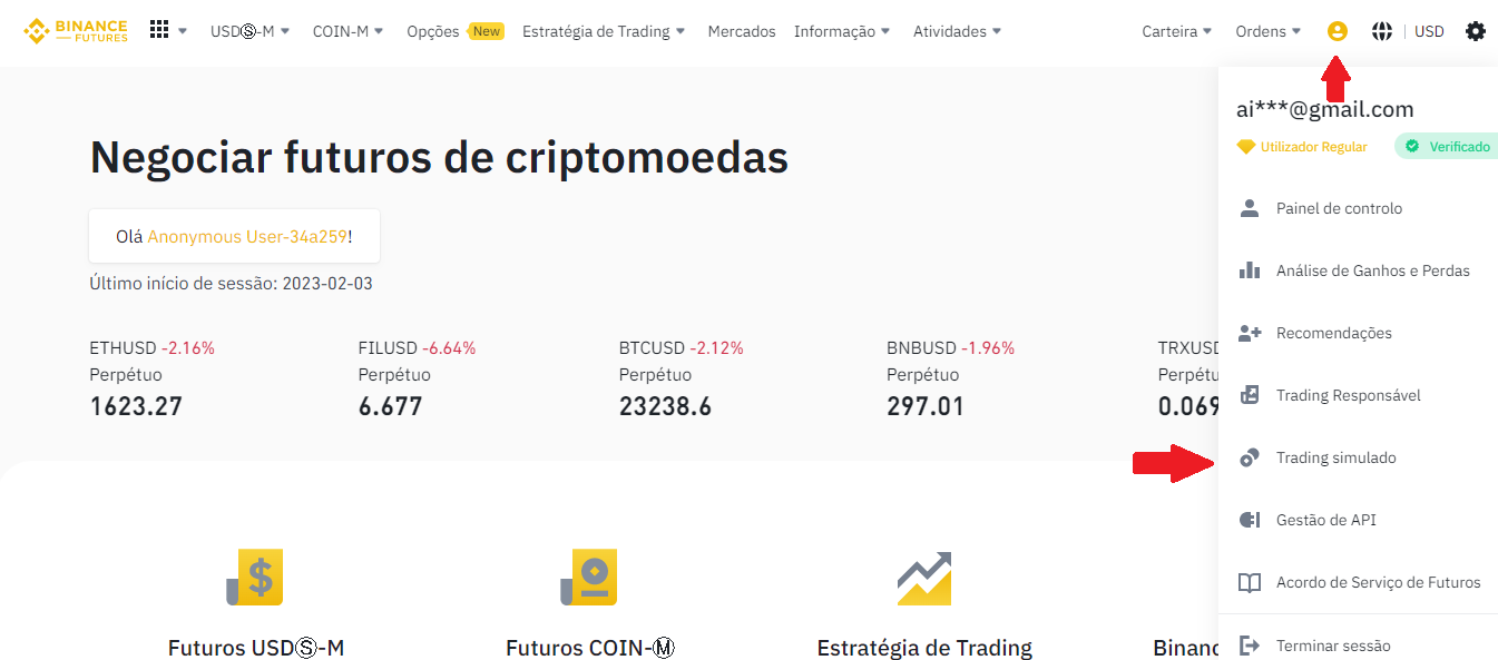 O próximo passo é habilitar a sua conta DEMO. Clique no ícone de perfil e depois clique em “Trading simulado“. Essa é a plataforma de demonstração da exchange. Aqui, a Binance vai te “emprestar” USDT falso para você treinar as suas habilidades de trading.