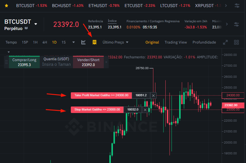 Ainda que você esteja usando um sinal de trading de criptomoedas, é importante acompanhar o seu trading. O mercado de criptomoedas é muito volátil e tudo pode mudar de uma hora para outra. Ao clicar no ícone mostrado na imagem abaixo, a Binance vai te mostrar as informações para o seu trading no gráfico.
