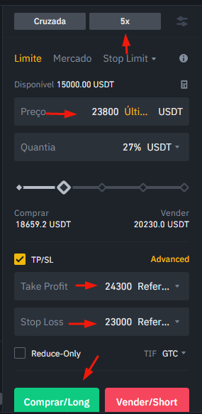 Na imagem acima, mostramos todos os dados necessários que você precisa informar sobre o trading, como a alavancagem de x5, o valor de compra do BTC (US$ 23.800) o stop loss (US$ 23.000) e qual é o valor que queremos vender as criptomoedas (US$ 24.300). Depois é só clicar em comprar.