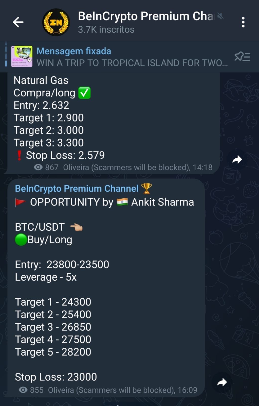No exemplo acima, o sinal nos informa o par de criptomoedas usado (BTC/USDT) e o tipo de operação (compra/long). Além disso, o sinal nos informa qual é o valor ideal para comprar o par de criptomoedas (entre US$ 23.500 e US$ 23.800) e qual é a alavancagem sugerida (5x).