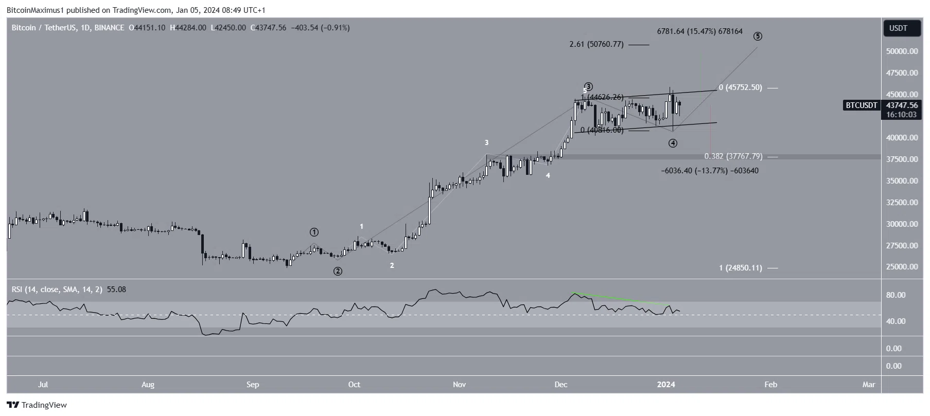 Se o preço do BTC sair do canal, poderá subir 15% até a próxima resistência em US$ 50.800. A retração externa de 2,61 da onda quatro cria a resistência.