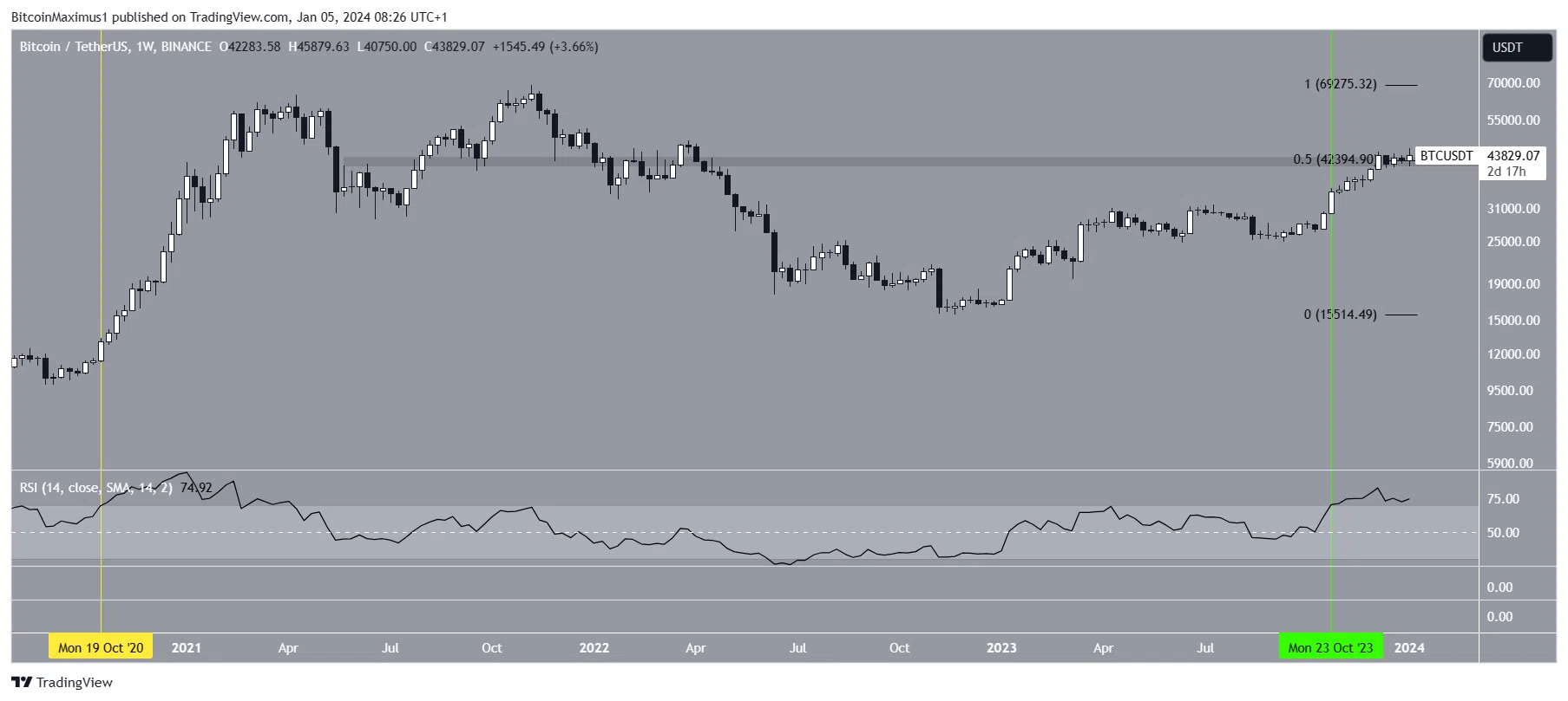 A análise técnica do período semanal mostra que o preço do BTC tem apresentado uma tendência ascendente desde o início de 2023. O aumento acelerou quando o Índice de Força Relativa semanal passou para território de sobre compra (verde).