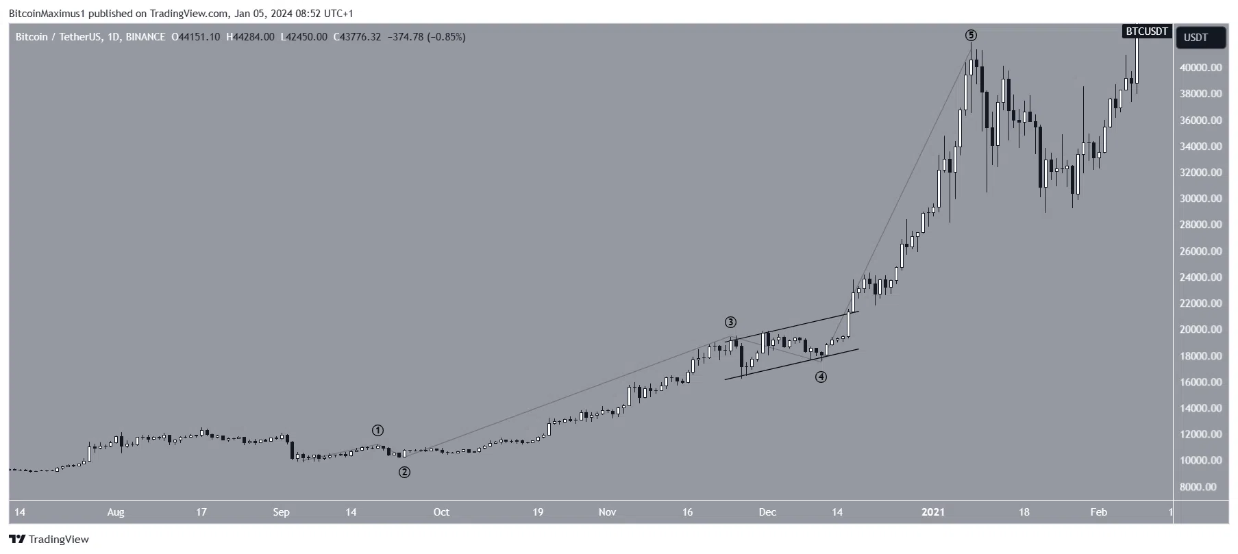 Um fractal muito interessante vem de novembro de 2020. Então, o preço do Bitcoin completou uma onda quatro semelhante em um canal paralelo ascendente antes de um rompimento levar a uma alta parabólica.