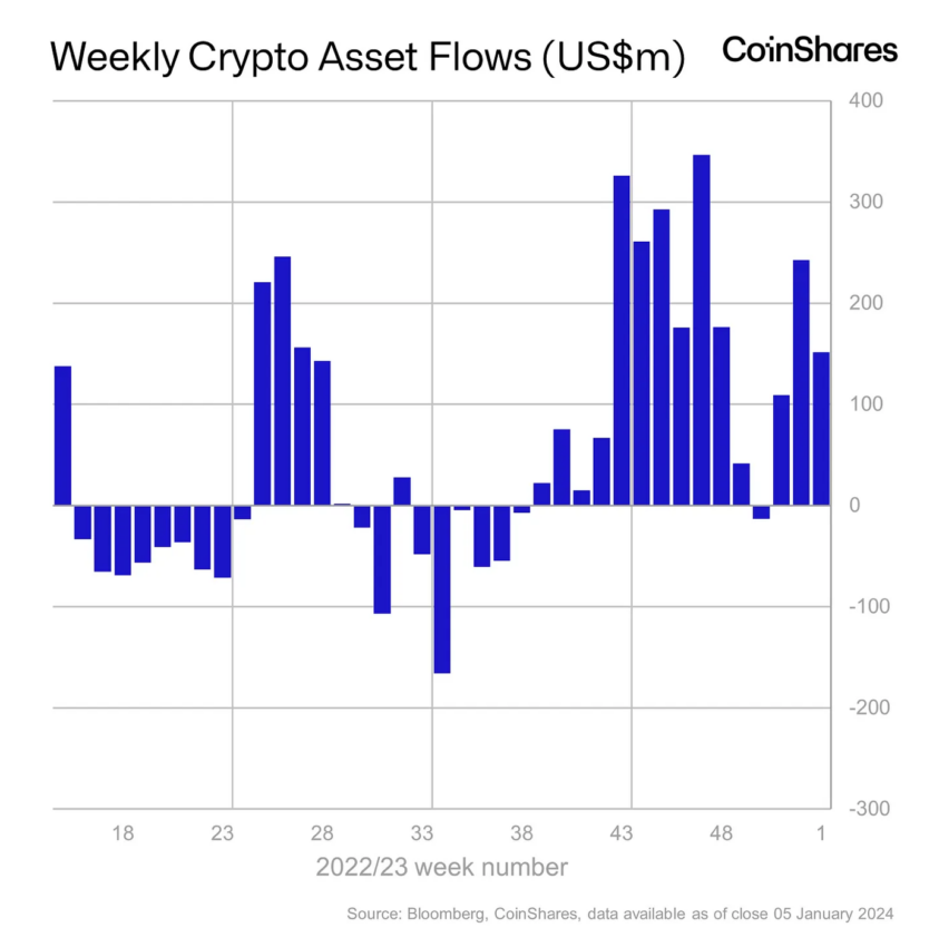 As entradas em criptomoedas totalizaram US$ 151 milhões na primeira semana de 2024, com o Bitcoin liderando com US$ 113 milhões nas últimas nove semanas.