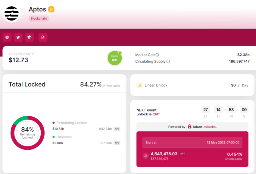 No entanto, 84% da oferta total do Aptos (842,74 milhões de APT) ainda está bloqueado, de acordo com o Token.unlocks. O próximo desbloqueio de tokens deve ocorrer em 27 dias.