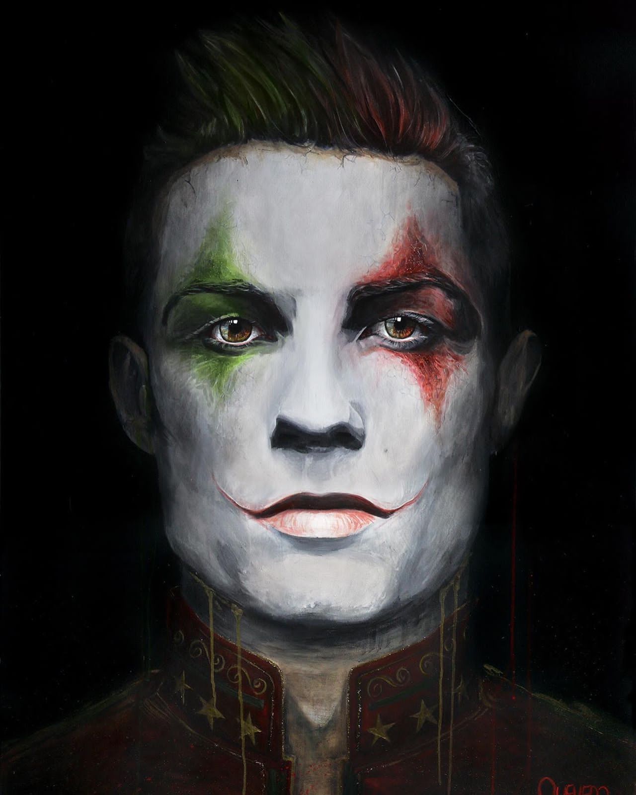 Sponsored“Coincidentemente, o número do Cristiano Ronaldo é 7. Ele usa 7 para tudo. E a tela dele foi a sétima que pintei, foi sem querer. Pintei o Cristiano como um príncipe, com uma máscara, uma maquiagem branca, com os detalhes de clown nos olhos. Uma coisa bem clássica e mais sóbria do que um palhaço engraçado. Fiz um príncipe real com as cores de Portugal”.