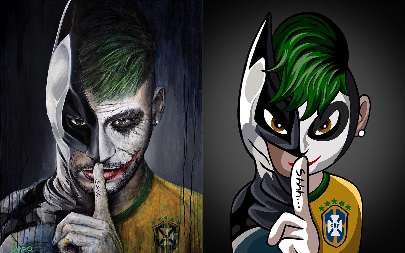 “Caramba, era isso que eu precisava. É um palhaço e é o Neymar. Descobri que ele era fã do Batman, que ele tem uma tatuagem do Batman nas costas… aí veio na cabeça a ideia de fazer o Coringa e Batman. Na hora eu visualizei a imagem da tela, eu só não sabia qual foto que seria, mas quando achei aquela imagem com o dedo na boca, fazendo um Shhh… foi inevitável… o dedo até divide o rosto… um lado para cada personagem”.