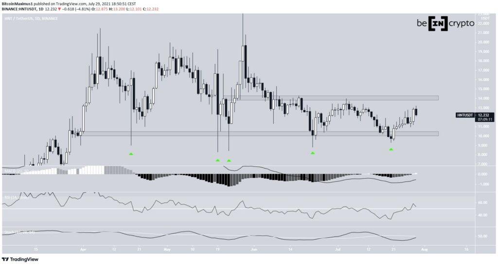 Desde o início de abril, o HNT voltou a subir após atingir área de suporte de US$ 10,20 (ícones verdes). Os indicadores técnicos são neutros, com tendência de alta. A criptomoeda possui resistência em US$ 14,05.