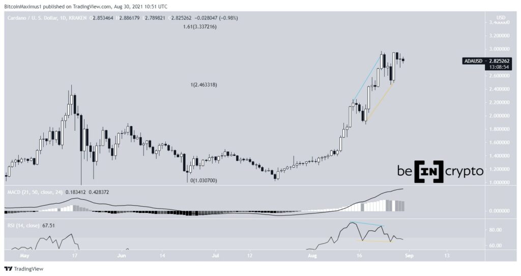 A ADA está subindo desde que foi negociada por US$ 1,02 em 20 de julho. Até agora, a criptomoeda atingiu a máxima histórica de US$ 3,08 na manhã de quinta-feira (2).