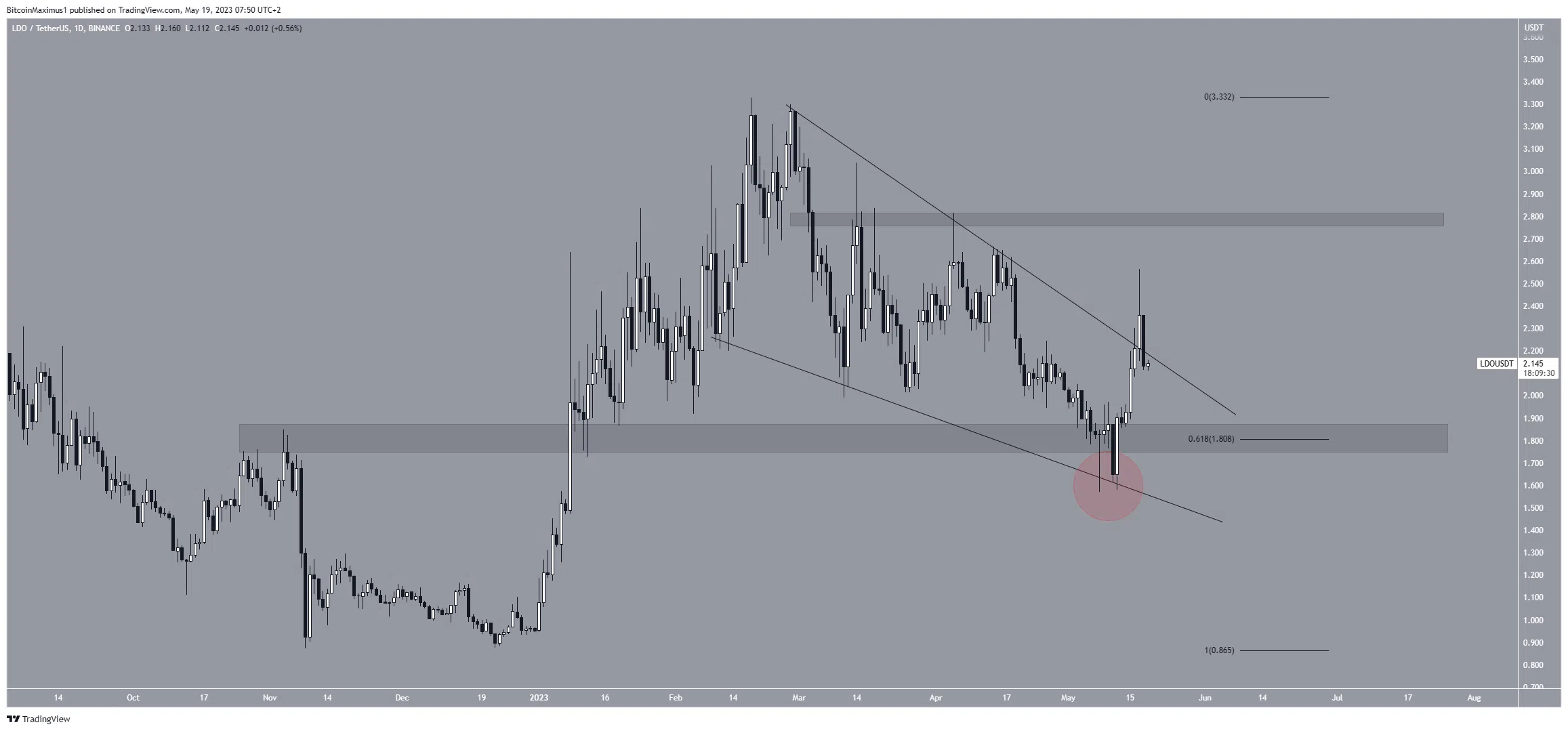 Isso iniciou um movimento ascendente que aparentemente causou uma quebra em 17 de maio. No entanto, a LDO não conseguiu ultrapassar a linha de resistência da cunha. Em vez disso, criou um longo pavio superior e caiu.