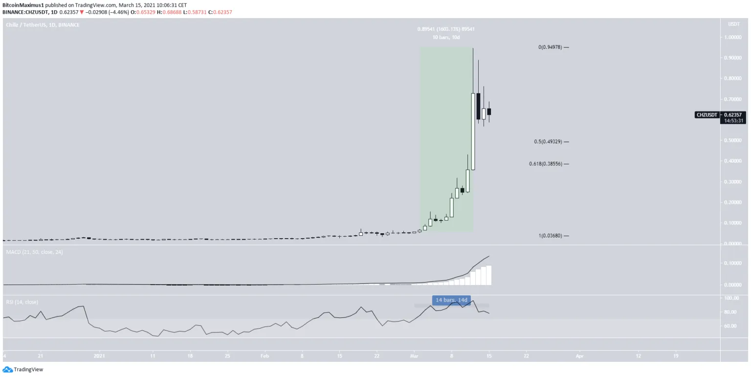 A Chiliz (CHZ) atingiu o preço mais alto de todos os tempos de US$ 0.94 no dia 10 de março. A alta é completamente parabólica e algum tipo de retração pode ser esperado.