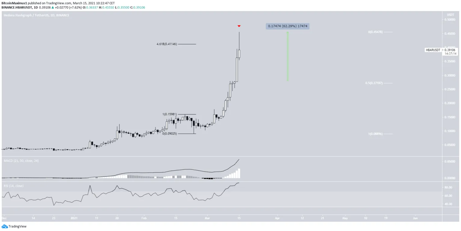 O Hedera Hashgraph (HBAR) está em alta desde o dia 23 de fevereiro. O ativo teve uma ruptura absoluta nos últimos dois dias, chegando em um momento a crescer 62%. Isso levou a um máximo histórico de US$ 0.45 em 15 de março.