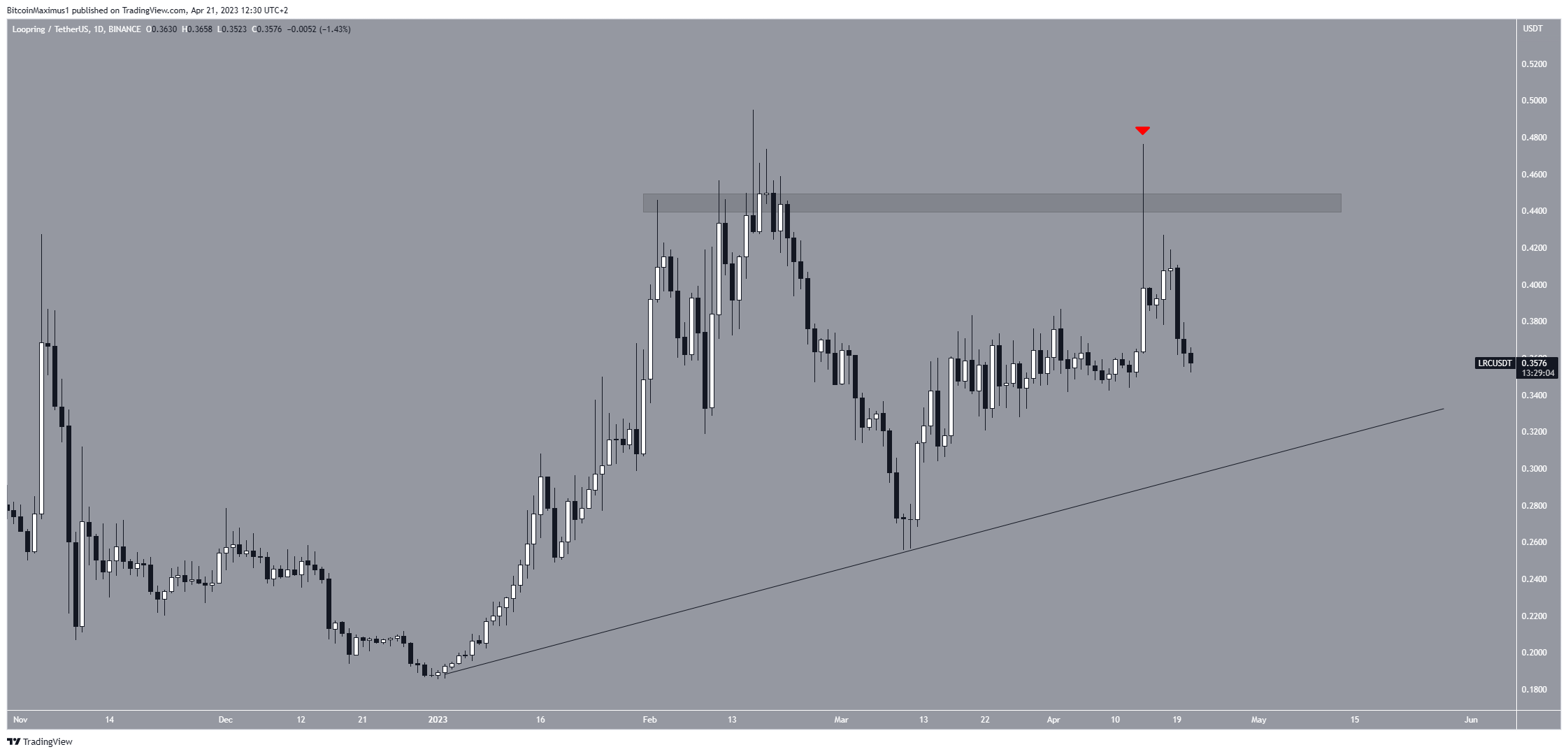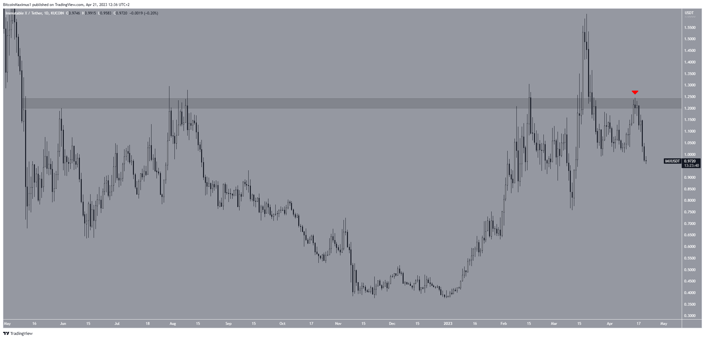 O preço do IMX caiu desde 19 de março. Em 29 de março, caiu abaixo da resistência de nível de preço de US$ 1,20 e o validou como resistência em 15 de abril (ícone vermelho). Isso é considerado um sinal de fraqueza que muitas vezes leva a quedas de preço.