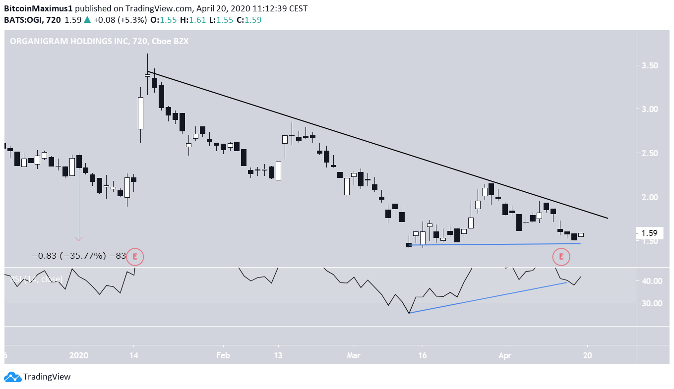 Um padrão semelhante é visto no preço da Organigram Holdings (OGI). Caiu 35% desde o início do ano, sendo duas vezes menos volátil que o ACRG. Além disso, também criou um fundo duplo, que é combinado com divergência de alta no RSI. Portanto, a perspectiva é quase idêntica à do ACRG, com a única diferença sendo a queda consideravelmente menor antes do fundo.
