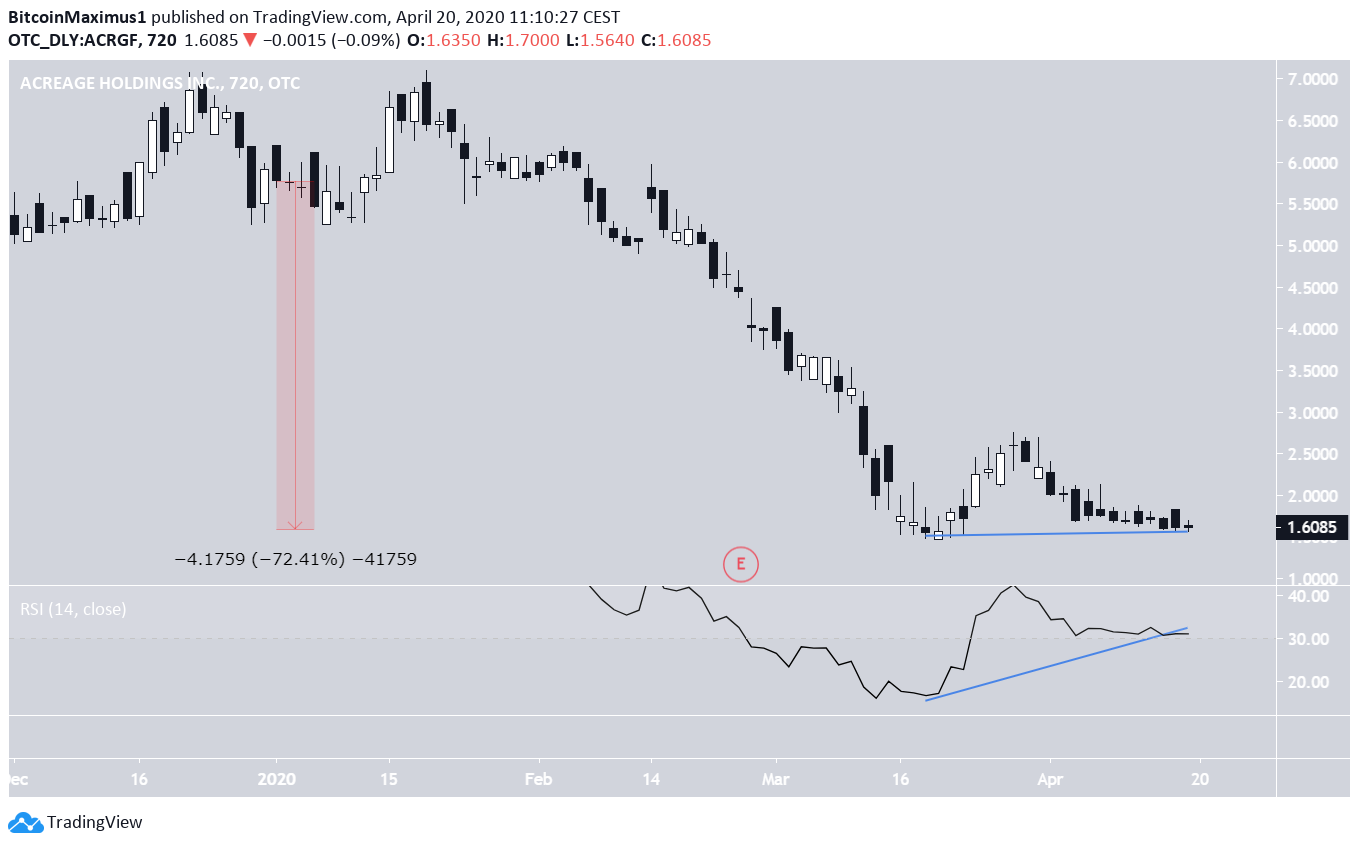 Sponsored SponsoredA Acreage Holdings (ACRGF) caiu significativamente em 2020, o que representa um aumento de 72%. No entanto, criou um fundo duplo ao preço atual de US $ 1,6, que é combinado com divergência de alta no RSI. O fundo duplo é um forte padrão de reversão que ganha ainda mais significância combinado com a leitura do RSI.