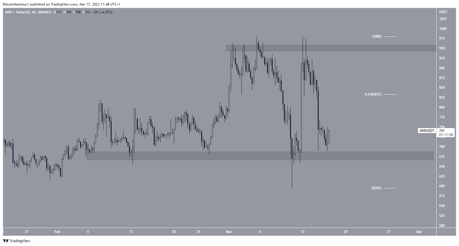 O preço do Maker (MKR) foi negociado em uma faixa entre US$ 675 e US$ 950 desde o início de fevereiro. Mais recentemente, foi rejeitado pela faixa de alta em 14 de março (ícones vermelhos) e iniciou o atual movimento de queda.