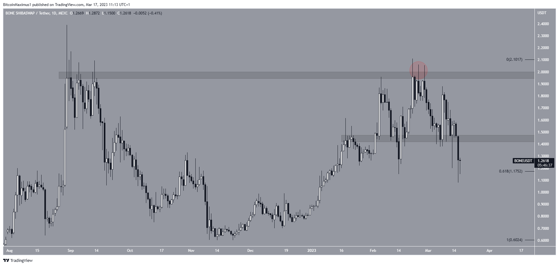 A BONE está em queda desde que não conseguiu passar pela área de resistência de US$ 1,95 no início de março (círculo vermelho). Inicialmente, o preço saltou na área de suporte horizontal de US$ 1,45. No entanto, caiu abaixo dela em 16 de março.