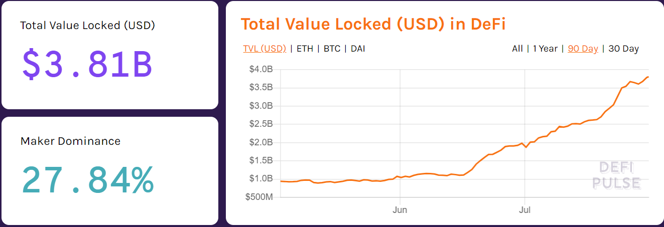 O setor de DeFi dobrou este mês em termos de TVL e não parece que estará irá desacelerar em breve. A plataforma líder Maker continua a aumentar sua participação de mercado e TVL, que agora está em US $ 1,06 bilhão como a Dai no DeFi também atinge uma nova alta de US $ 374 milhões.