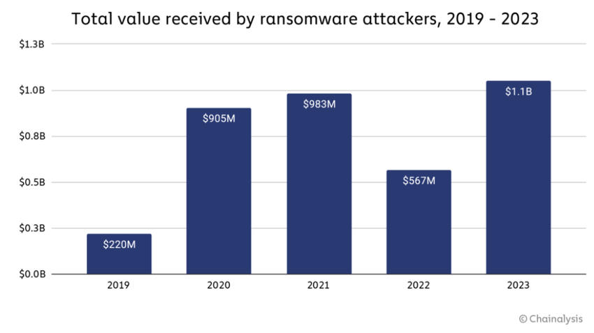O ransomware envolve a implantação de malware que restringe o acesso a sistemas ou dados de computador e exige resgate, geralmente em cripto, para sua liberação. A empresa de análise de blockchain Chainalysis observou que os pagamentos de ataques de ransomware relacionados a criptografia quase dobraram para mais de US$ 1 bilhão em 2023.