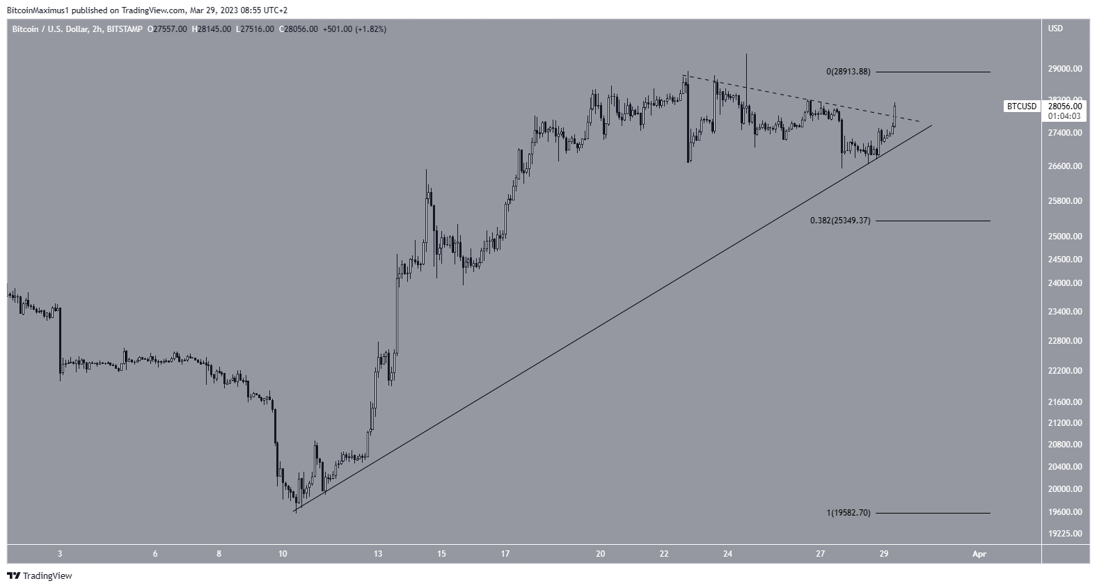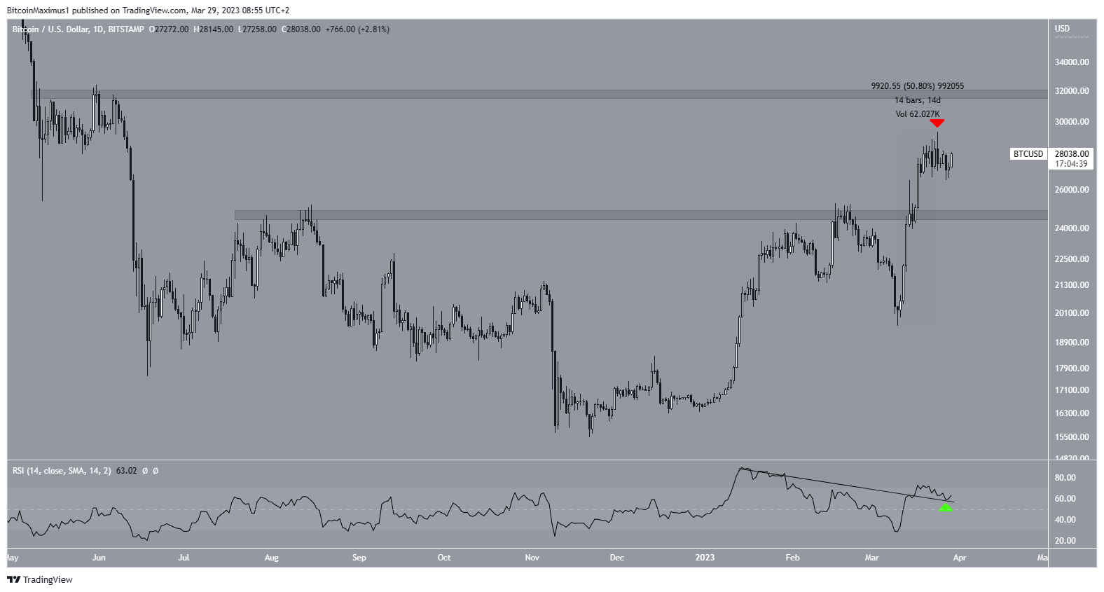 O preço do Bitcoin começou a subir rapidamente em 10 de março. Em um período de 14 dias, valorizou quase 50%, atingindo uma nova máxima anual de US$ 29.380. No entanto, o preço criou um candle de baixa e caiu ligeiramente desde então (ícone vermelho).