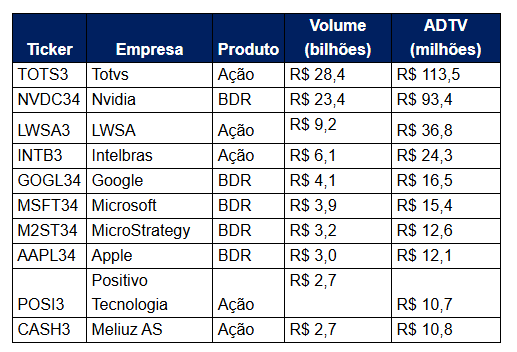 A Totvs (TOTS3) foi o ativo mais negociado do segmento, com R$ 28,4 bilhões em volume. o volume médio diário (ADTV) foi de R$ 113,5 milhões.