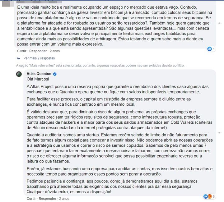 Um investidor comenta que está testando o Atlas Quantum, e que pensa em até colocar mais dinheiro na companhia. A publicação de dois anos atrás fala também sobre uma desconfiança nas operações com Bitcoin. Esse usuário explica que ninguém deveria deixar suas criptomoedas em posse de algum negócio.