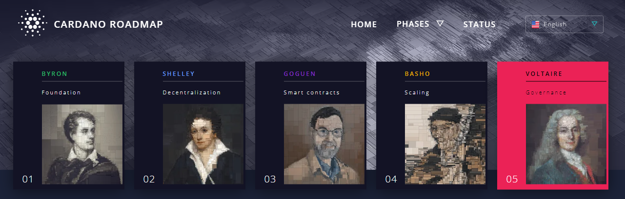 As fases de desenvolvimento de Cardano, ou “eras”, têm o nome de figuras proeminentes da poesia e da ciência da computação, como Lord Byron, Percy Bysshe Shelley, Joseph Goguen, Matsuo Bashō e Voltaire. Assim, os três estágios iniciais introduziram uma blockchain básica, descentralização e contratos inteligentes.