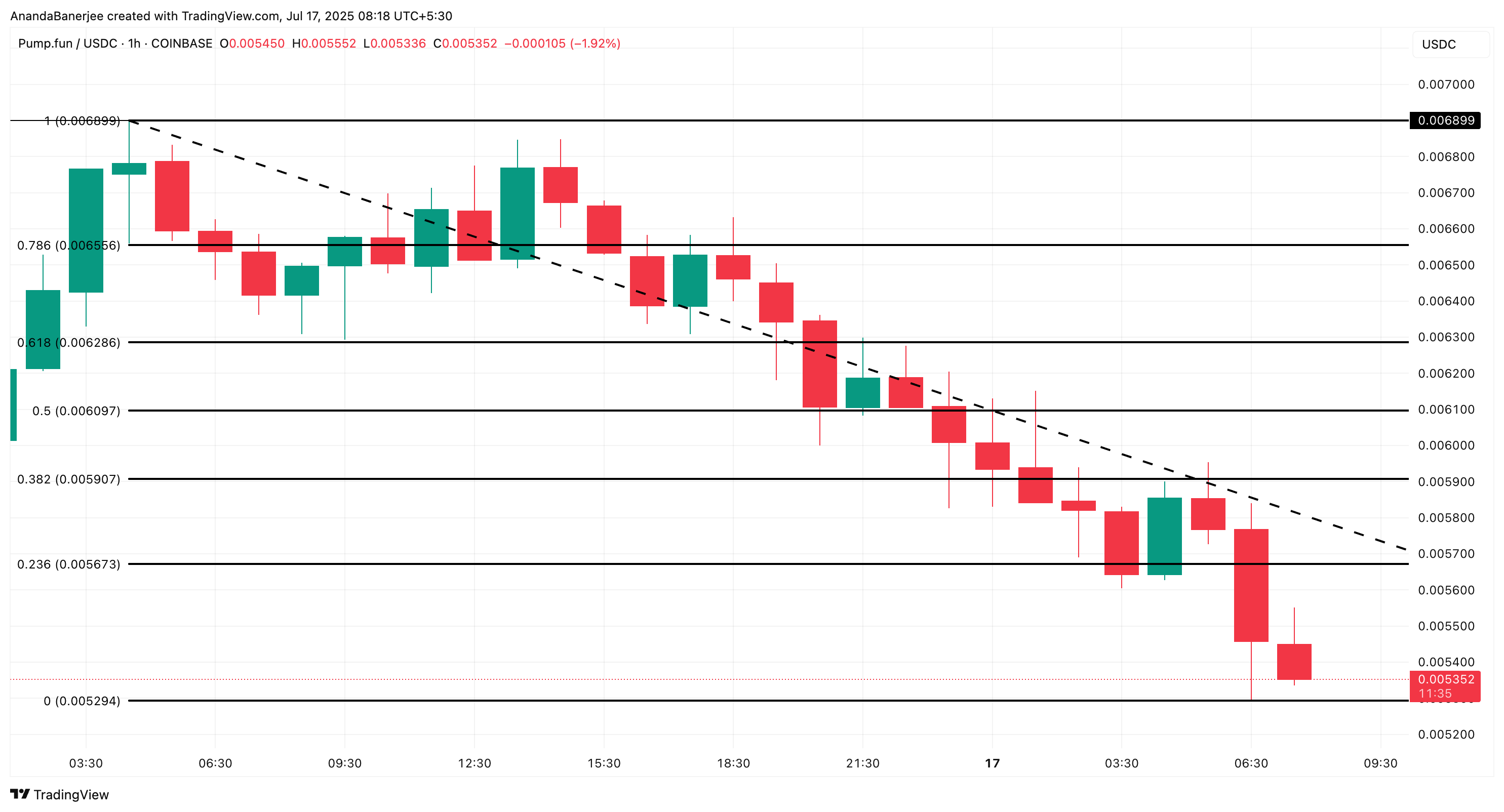 O token nativo da plataforma Pump.fun, PUMP, registrou queda após atingir uma máxima local de US$ 0,006899 em 16 de julho. Em poucas horas, o preço caiu para US$ 0,005294, acumulando uma retração de 23,2% em meio à realização de lucros por parte dos primeiros investidores e à redução do apetite comprador.