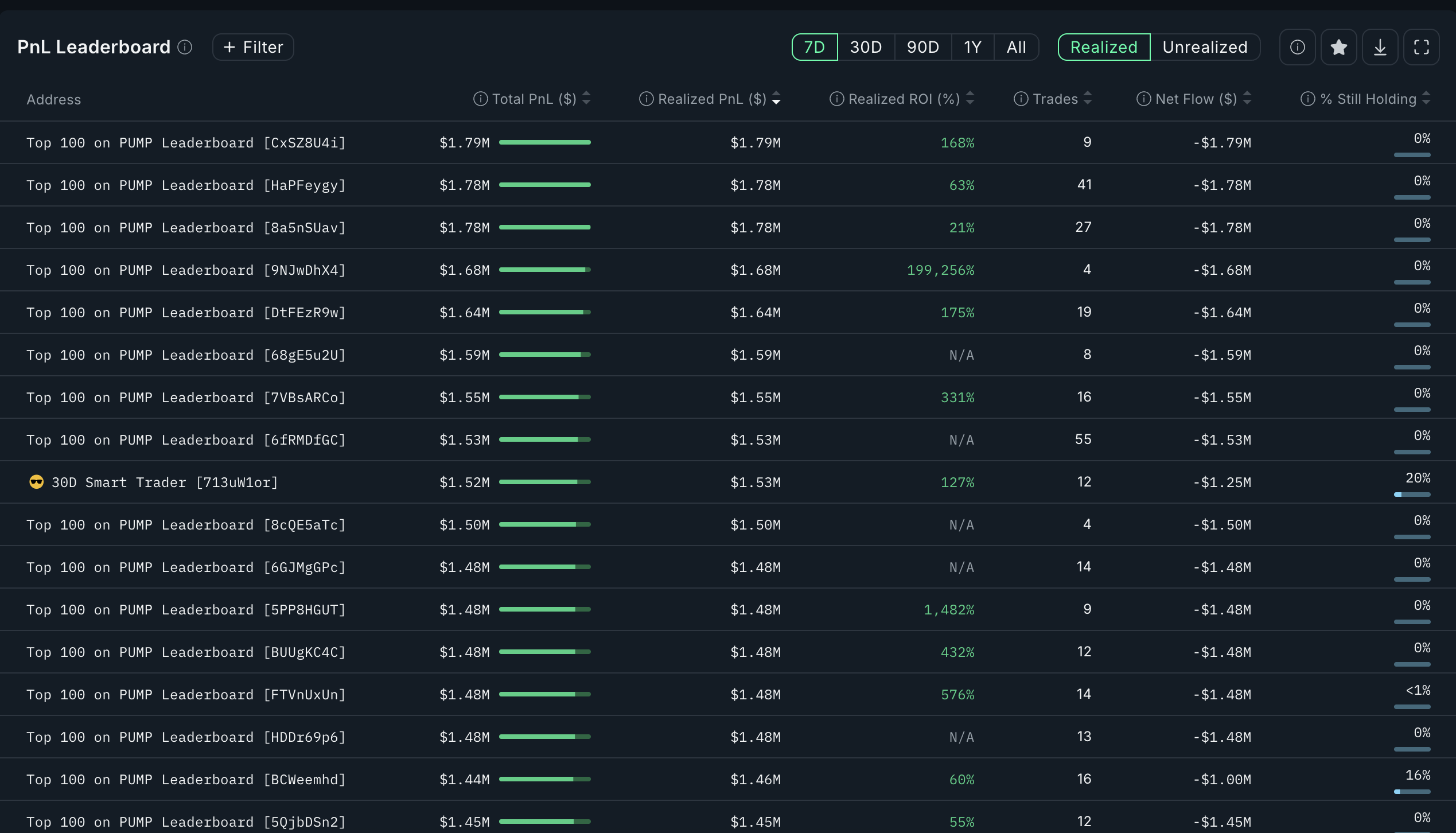 Dados on-chain apontam que as dez maiores carteiras de PUMP realizaram mais de US$ 17 milhões em lucros nas últimas horas. A carteira CxSZ84Ui, por exemplo, liquidou US$ 1,79 milhão, enquanto outras oito superaram US$ 1,5 milhão cada. Mais de 95% das carteiras líderes zeraram suas posições, o que indica saída generalizada.