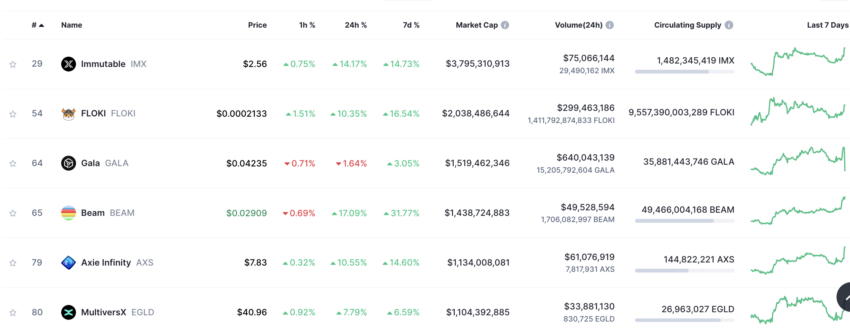 Os principais tokens de jogos, incluindo Immutable (IMX), Gala, Axie Infinity (AXS), MultiversX, The Sandbox, Decentraland e ApeCoin, mostraram um crescimento impressionante variando de 3% a 31%.