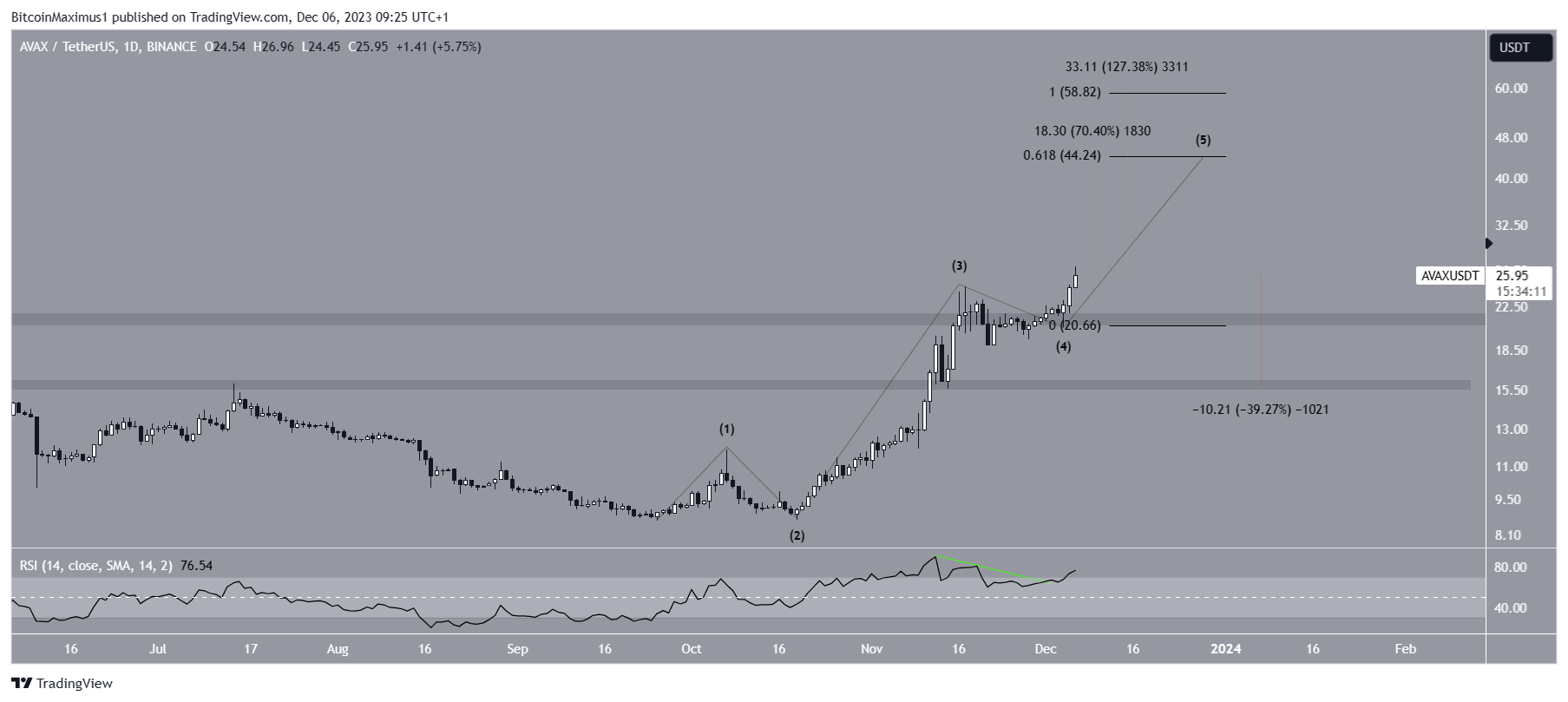 A contagem de ondas mais provável no gráfico sugere que a Avalanche está na quinta e última onda do seu movimento de alta que começou em outubro.