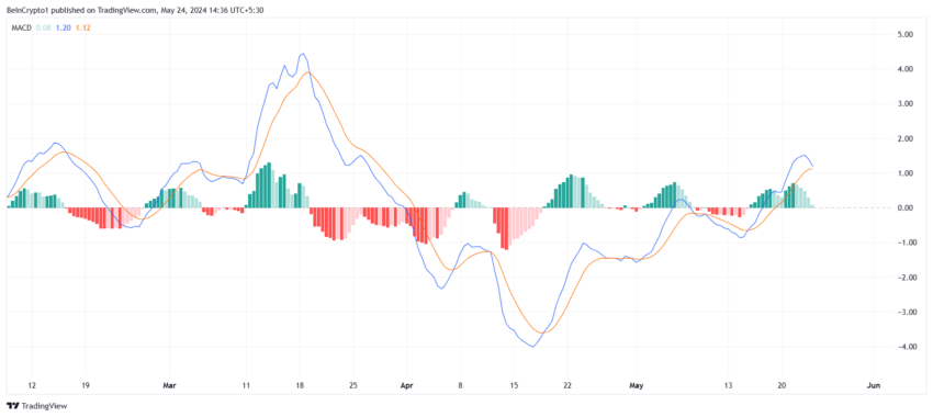 Uma das razões por trás disso é a falta de impulso do mercado mais amplo, conforme evidenciado pelo MACD. O MACD é um indicador de momentum que mostra a relação entre duas médias móveis do preço de um ativo, fornecendo sinais de compra e venda.