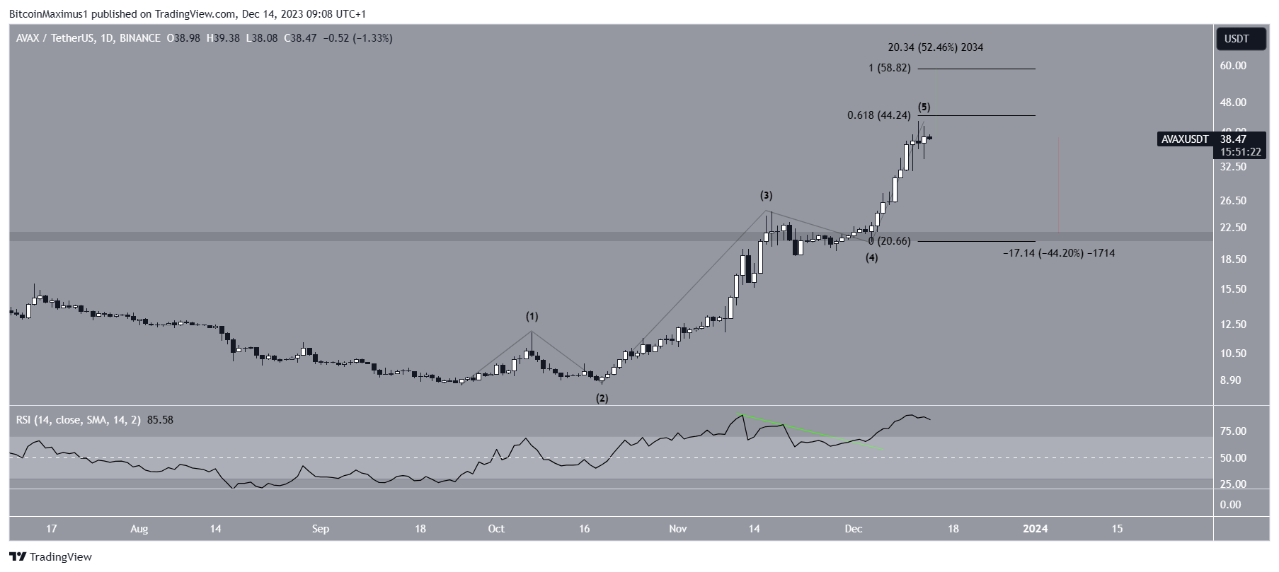 A contagem de ondas no gráfico diário sugere que a Avalanche está na quinta e última onda de um movimento de cinco ondas que começou em outubro. O preço pode estar se aproximando do topo, já que a onda cinco teve 0,618 o comprimento das ondas um e três combinadas.