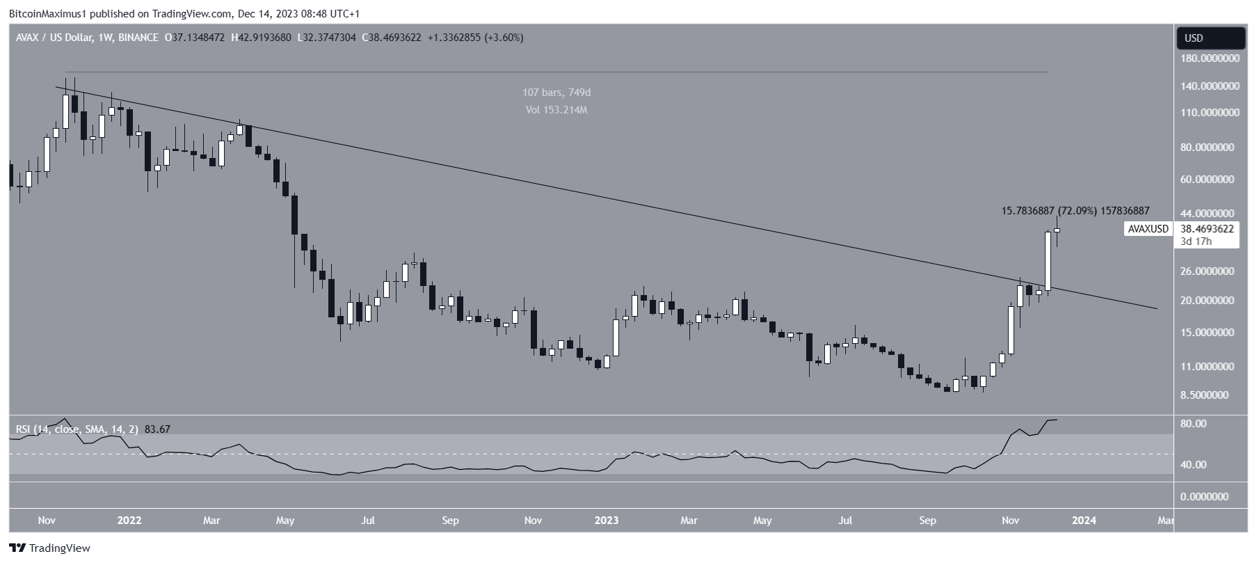 Durante o movimento, a AVAX rompeu uma linha de tendência de baixa de longo prazo, que existia há 750 dias. Isso acelerou ainda mais a taxa de crescimento, criando um candle de alta com magnitude de 70%.