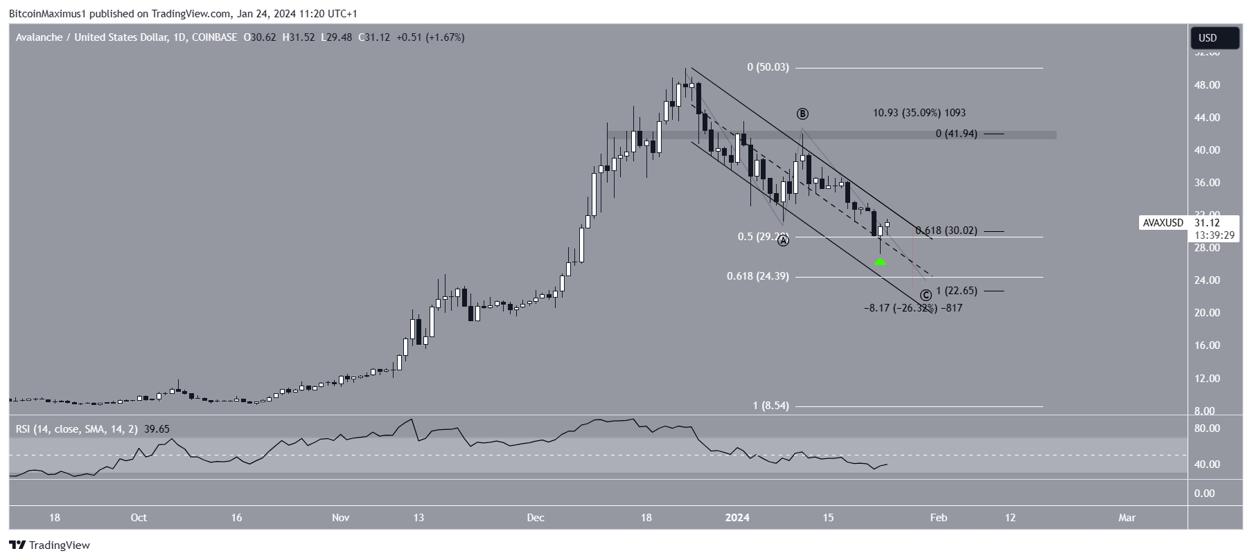 Apesar da previsão de alta, cair abaixo da mínima de US$ 27,22 significará que o preço ainda está em correção. Então, a AVAX pode cair 26% para a linha de suporte do canal em US$ 22,65. Isso dará às ondas A:C uma proporção de 1:1.